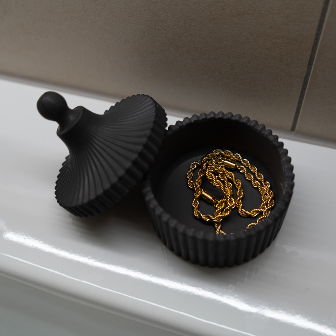 Platziere eine elegante, schwarze Schmuckschatulle auf der Badezimmerablage. Der tiefschwarze Farbton fügt sich nahtlos ein und verleiht dem Raum eine edle Note. Perfekt für Schmuck oder sonstige Gegenstände