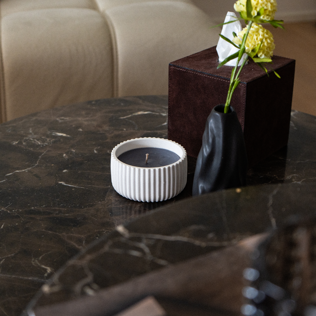 Platziere die Kerze auf einem stilvollen Couchtisch. Kombiniere sie mit ein paar edlen Büchern, einer Pflanze und eleganten Dekorationsgegenständen für ein luxuriöses Ensemble.